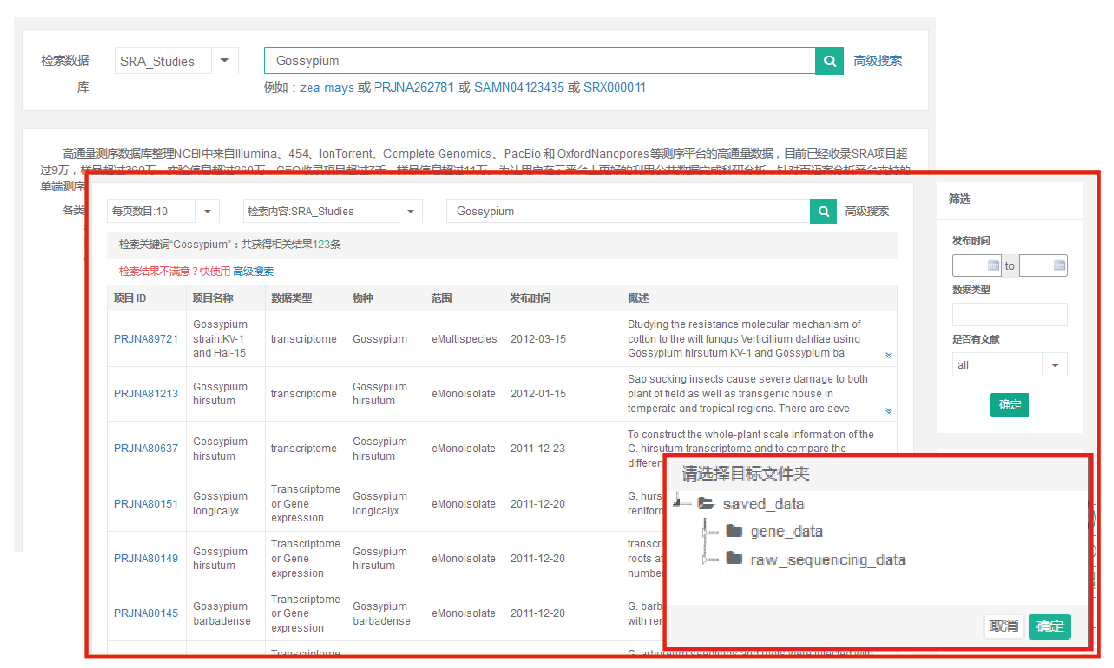 2)搜集SRA數(shù)據(jù)庫(kù)中,棉屬轉(zhuǎn)錄組數(shù)據(jù),共搜集得到154個(gè)來(lái)源于illumina平臺(tái)的棉屬轉(zhuǎn)錄組數(shù)據(jù)。BMKCloud公共數(shù)據(jù)模塊數(shù)據(jù)搜集過(guò)程:進(jìn)入平臺(tái)公共數(shù)據(jù)模塊,輸入關(guān)鍵詞“Gossypium”,并按SRA項(xiàng)目編號(hào)進(jìn)行檢索,使用數(shù)據(jù)類型“transcriptome”進(jìn)行過(guò)濾,最終得到104個(gè)項(xiàng)目數(shù)據(jù),可根據(jù)數(shù)據(jù)來(lái)源平臺(tái)在進(jìn)行進(jìn)一步手動(dòng)過(guò)濾,最后一鍵保存數(shù)據(jù)至用戶賬號(hào)用于后續(xù)分析