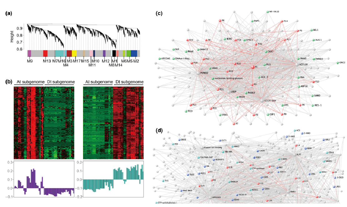 2)WGCNA分析共將上述基因劃分為17個(gè)模塊,其中模塊16與模塊12分別表現(xiàn)為D亞基因組、A亞基因組偏倚表達(dá),模塊16也在oxidation -reduction生物途徑上有顯著 富集,這一途徑一般認(rèn)為與棉纖維的發(fā)育相關(guān)。