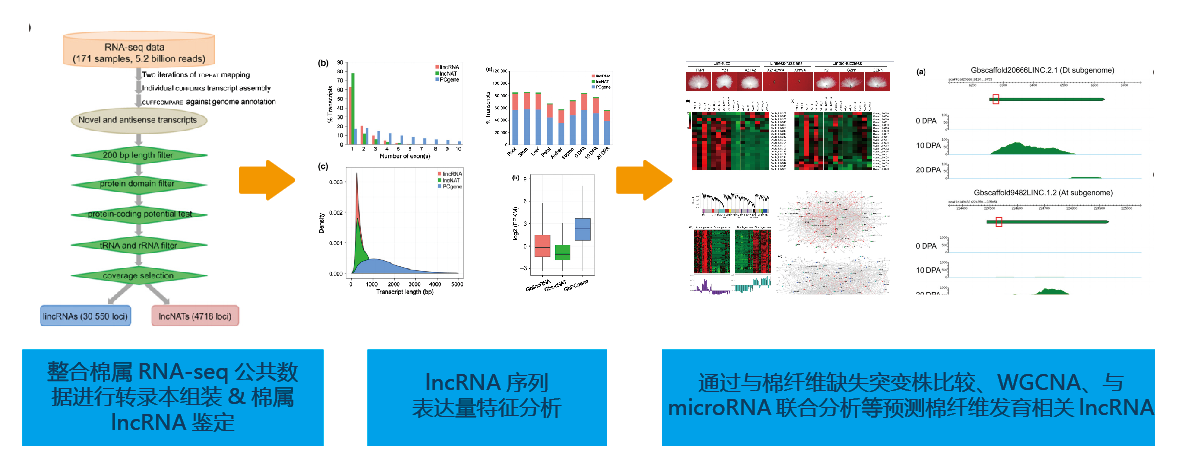 整合公共數(shù)據(jù)庫(kù)中棉屬RNA-seq數(shù)據(jù),進(jìn)行轉(zhuǎn)錄本重構(gòu)(有參)并鑒定其中l(wèi)ncRNA,用于后續(xù)的棉纖維發(fā)育相關(guān)lncRNA分析