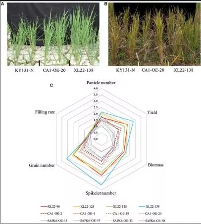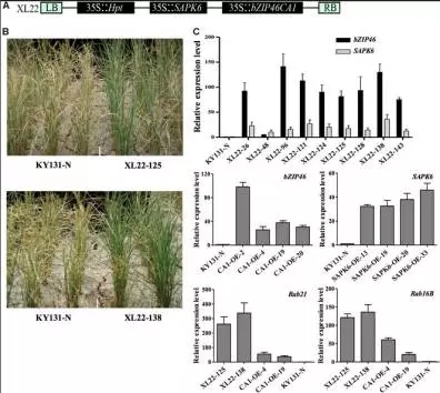水稻轉(zhuǎn)基因材料:XL22(OsbZIP46CA1+SAPK6),CA1-OE(OsbZIP46CA1),SAPK6-OE(SAPK6)