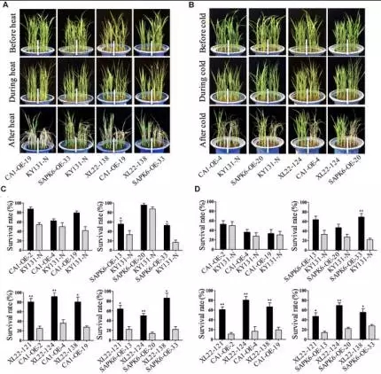 分別取XL22、CA1-OE、SAPK6-OE、KY-131-N的4葉齡種子材料,每個(gè)3個(gè)生物學(xué)重復(fù),均進(jìn)行42℃ 12小時(shí),4℃5天處理,最后正常環(huán)境下生長(zhǎng)7天,觀(guān)察這各材料之間的葉卷曲清苦以及存活率,結(jié)果顯示,XL22表現(xiàn)為個(gè)更高的存活率(圖5C),更加輕微的葉片卷曲(圖4A),表明XL22相較于單基因轉(zhuǎn)化株與非轉(zhuǎn)基因株擁有更強(qiáng)的耐熱、抗寒能力。