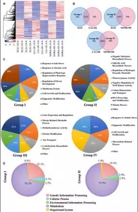 c)由于轉(zhuǎn)基因材料中過(guò)表達(dá)基因?yàn)閎ZIP家族轉(zhuǎn)錄因子及其活性激活基因家族,研究者重點(diǎn)關(guān)注了3個(gè)材料中轉(zhuǎn)錄上調(diào)的基因,這些基因被劃分為4類(lèi):Group1,XL22相較于CA1-OE特有上調(diào)基因,645個(gè);Group2,XL22相較于SAPK6-OE特有上調(diào)基因,500個(gè)基因特異上調(diào);Group3,CA1-OE相較于SAPK6-OE特有上調(diào)基因,398個(gè);Group4,SAPK6-OE相較于CA1-OE特有上調(diào)基因,869個(gè)。Group I主要分布在“Response to ABA”、“Regulation of Plant-type Hypersensitive response”等GO term;Group II主要分布在“Organic Substance Biosynthetic Process” 、“Salicylic Acid Biosynthetic Process” 、“Regulation of Hydrogen Peroxide Metabolic Process”等GO term;Group3主要分布在“Gene Expression and Regulation”、 “Nitrate Related Metabolic Process” 、 “Carbohydrate Biosynthetic Process” 等GO term;Group4主要分布在 “Cytokinesis and Cell Proliferation”、“Microtubule Related Process”、“Response to Abiotic Stress” 等GOterm(見(jiàn)圖6C)。因此推測(cè),XL22中的兩個(gè)基因可能激活了不同的干旱脅迫應(yīng)答基因。