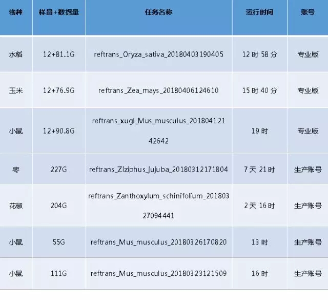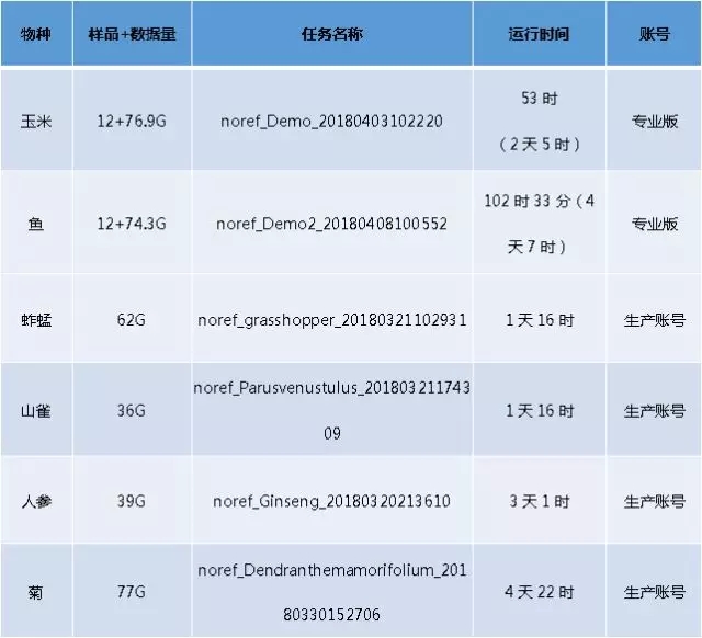無(wú)參轉(zhuǎn)錄組分析數(shù)據(jù)表明,12個(gè)玉米樣本共76.9G,專(zhuān)業(yè)版賬號(hào)中最快可以在2天5小時(shí)完成交付。而在生產(chǎn)賬號(hào)中,山雀(36G)和蚱蜢(62G)最快可在1天16小時(shí)完成分析。
