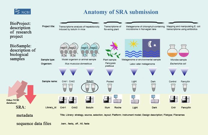 有過數(shù)據(jù)上傳經歷的童鞋應該對SRA并不陌生,上傳數(shù)據(jù)前我們一般要創(chuàng)建BioProject、BioSample,用于詳細說明項目信息、樣品信息;并通過SRA的Experiment、RUN描述建庫測序相關信息,如建庫類型、測序儀器、單雙端等;下圖概括出了幾者之間的關系。