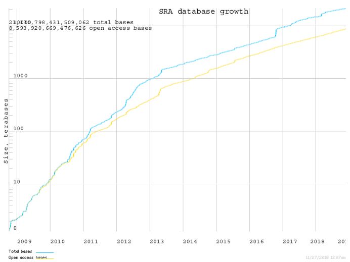 SRA數(shù)據(jù)量增長圖(縱坐標代表sra格式文件大小,單位TB;橫坐標代表年;藍線代表總數(shù)據(jù)量)