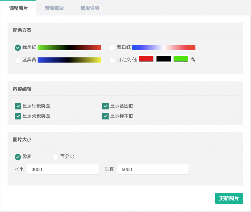 圖像編輯功能可實現熱圖顏色調整、樣本名修改、基因名修改、字體修改,同時支持png、pdf、svg不同尺寸圖片保存,方便大家在進行文章投稿過程或日常數據整理過程中對圖片的修改。