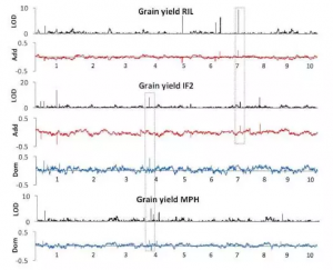 永久F2群體中,F(xiàn)1個體的中親值是根據(jù)F1個體本身的表現(xiàn)與雙親性狀值計算出來的。中親值=F1表型值-親本中親值。計算每個F1對應的中親值,以中親值為表型進行QTL定位,其QTL的效應是雜合子與雙親表現(xiàn)均值的差異。由于雜種優(yōu)勢QTL的特殊性,分別利用F2群體類型和RIL群體類型分別定位顯性QTL。所用軟件同上,在檢測顯性效應時同樣也檢測顯性和顯性互作QTL。